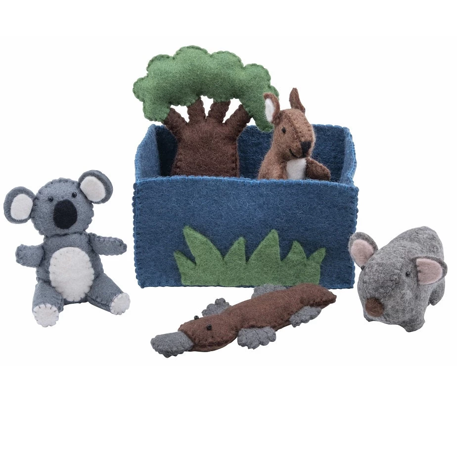 Playset includes a felt box, a tree, a platypus, a kangaroo, a koala and a wombat.