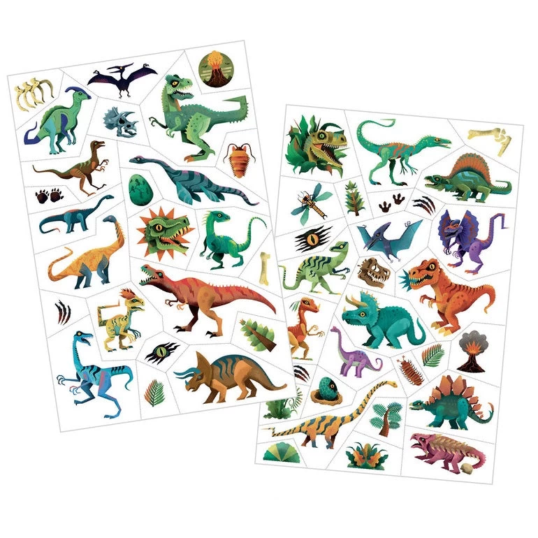 Show your love for prehistoric times with this set of two temporary tattoo sheets featuring dinosaurs! They are pre-cut, so they are easy to use: just apply a bit of water. Dermatologically tested.