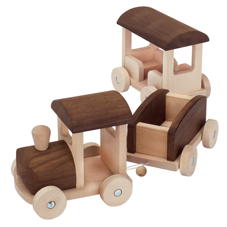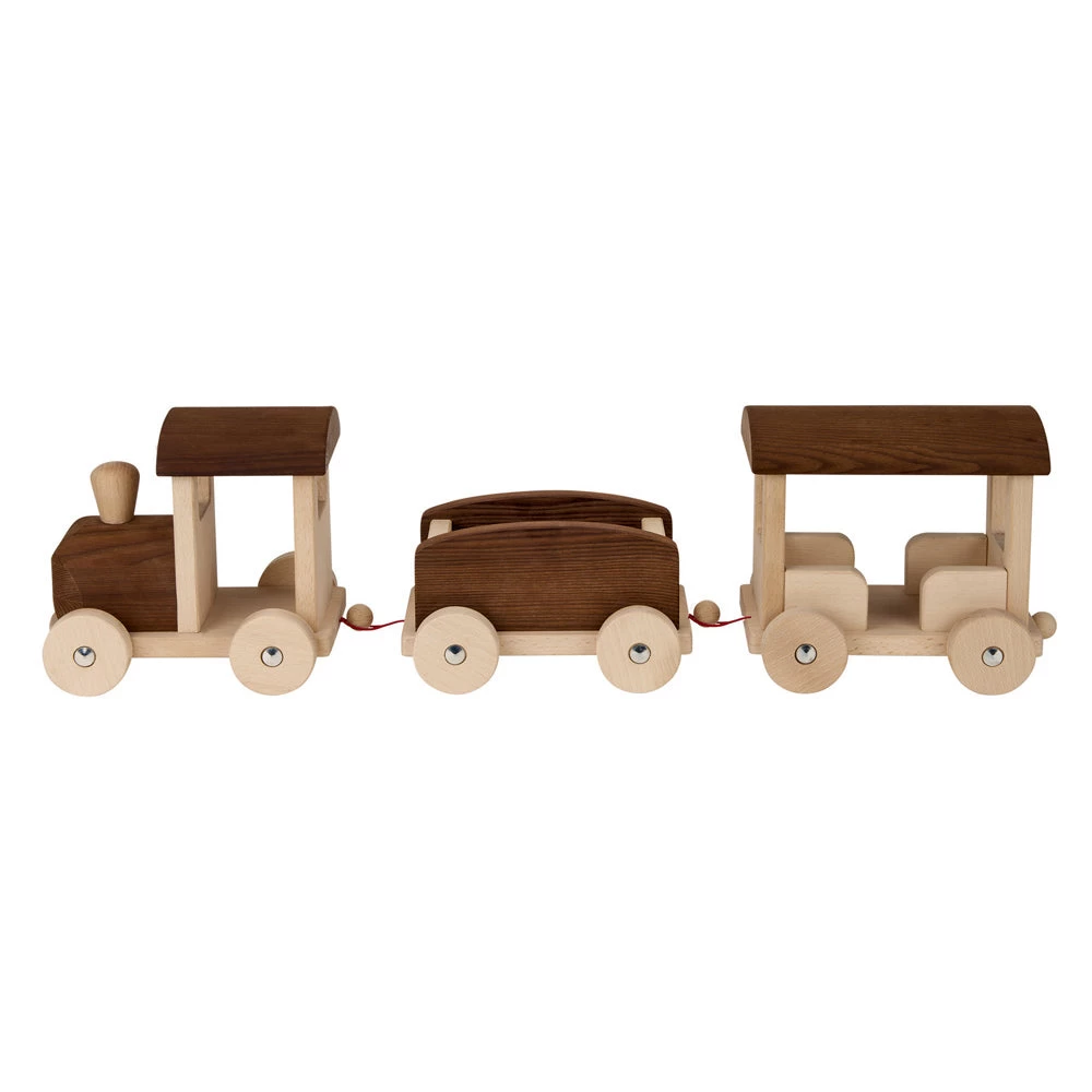 Be wowed by the size and beauty of our stunning large nature train! At 71cm long this heirloom piece has an engine with two carriages that hook together with a rope and ball. The wheels turn as it is pushed along, ready to load or unload its cargo and passengers. Made in Europe from solid timber, the Goki Nature range are thermally treated to create the variation in colour without the need for chemicals or varnish.