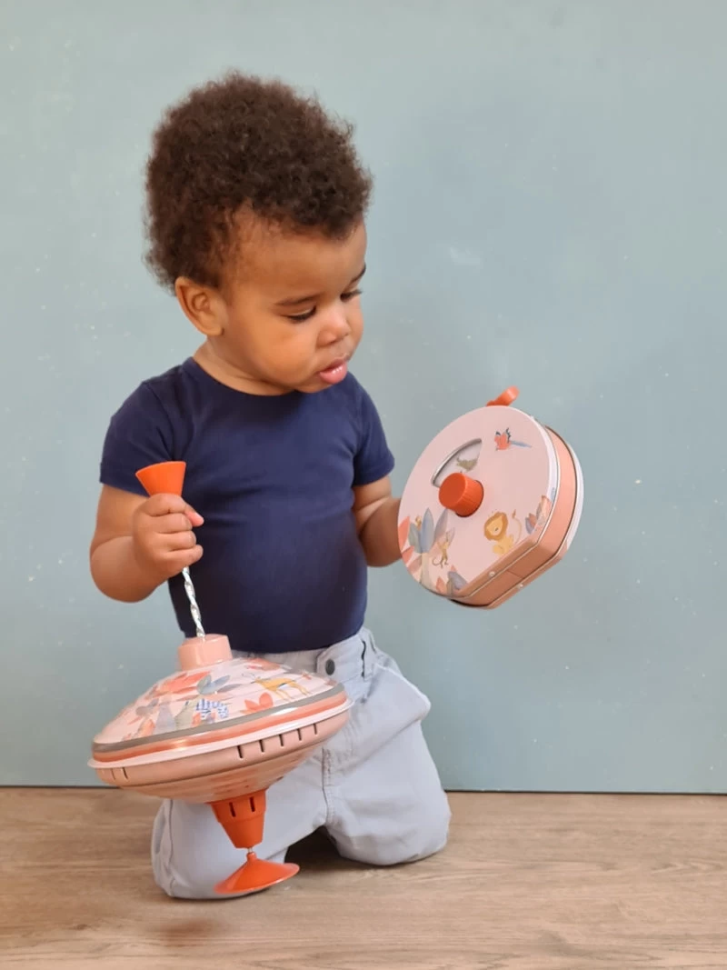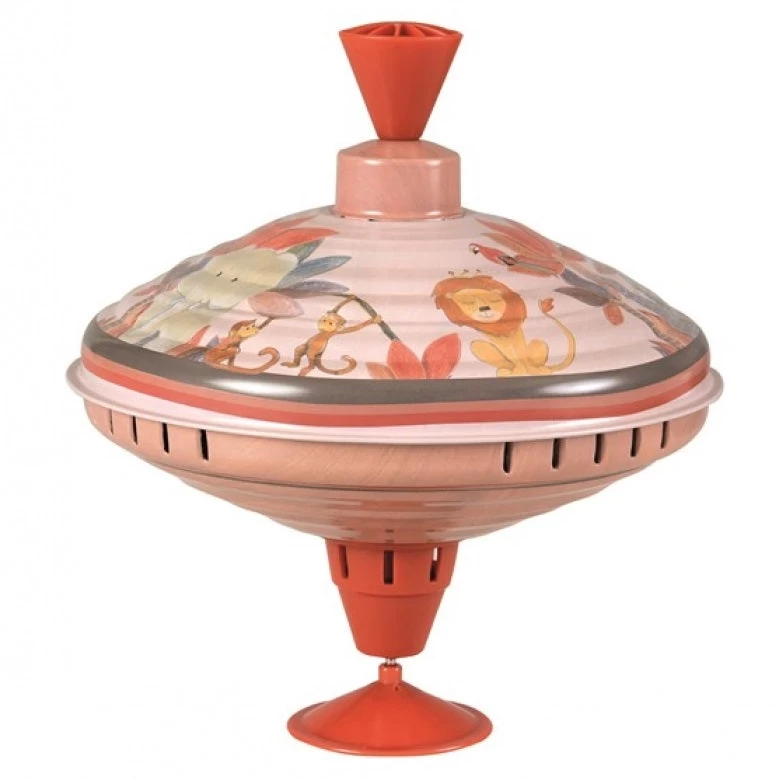 This classic spinning top is an adorable cause and effect toy, perfect for early hand-eye development. Pull and push on the handle and the jungle-themed top begins to spin and whirl.