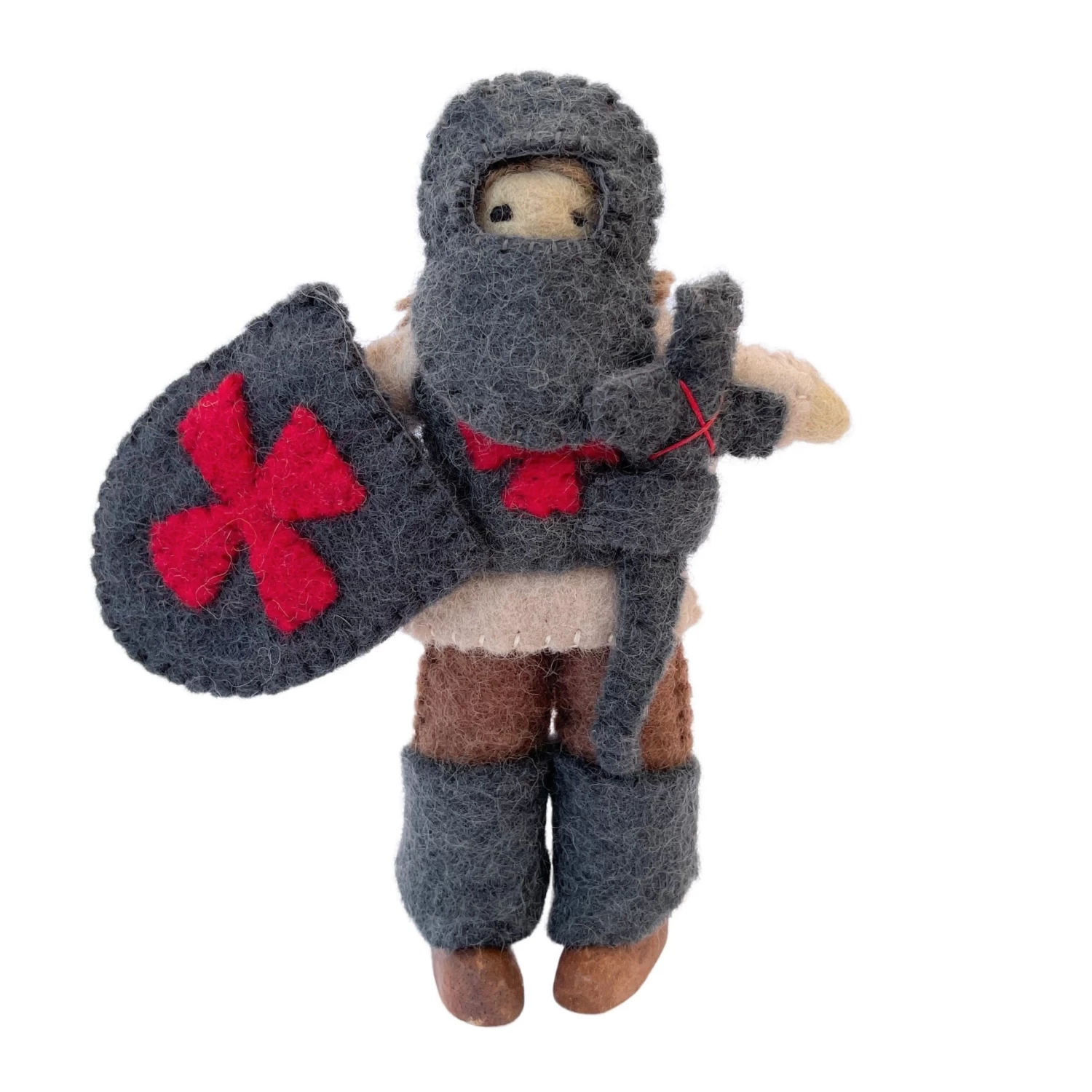 Enter a medieval world with our gallant knight and his trusty steed. The knight, measuring 20cm tall, is protected with a suit of armour and carries a shield and a sword – ready to battle against evil foes! All armour and accessories are removable and his wooden feet allow him to stand independently. The horse has a matching blanket and measures approximately 17cm tall.