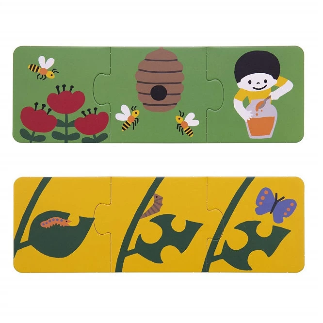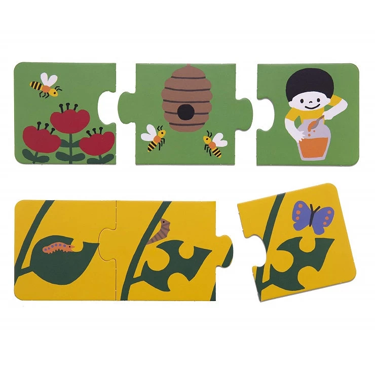 An egg becomes a chick, and then a hen. A caterpillar forms into a chrysalis and then emerges as a beautiful butterfly! Young children will delight in Kanae Sato’s delicate images while learning simple stories and logical sequences with these three-piece jigsaws. The five jigsaws feature specially commissioned child-friendly illustrations and come in an attractive box.