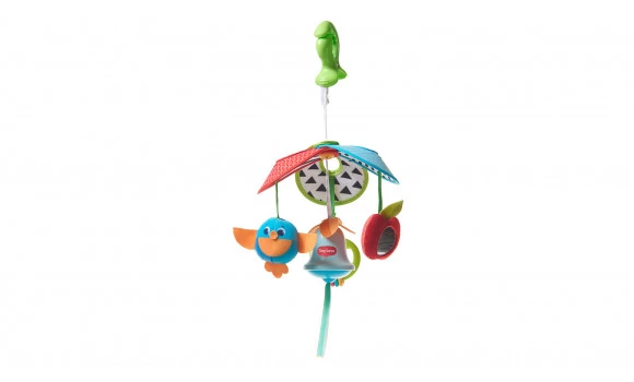The Tiny Love Pack n Go Mobile Meadow Days stimulates baby’s cognition, senses and curiosity with 4 activities including bell-shaped wind chime and bird rattle.