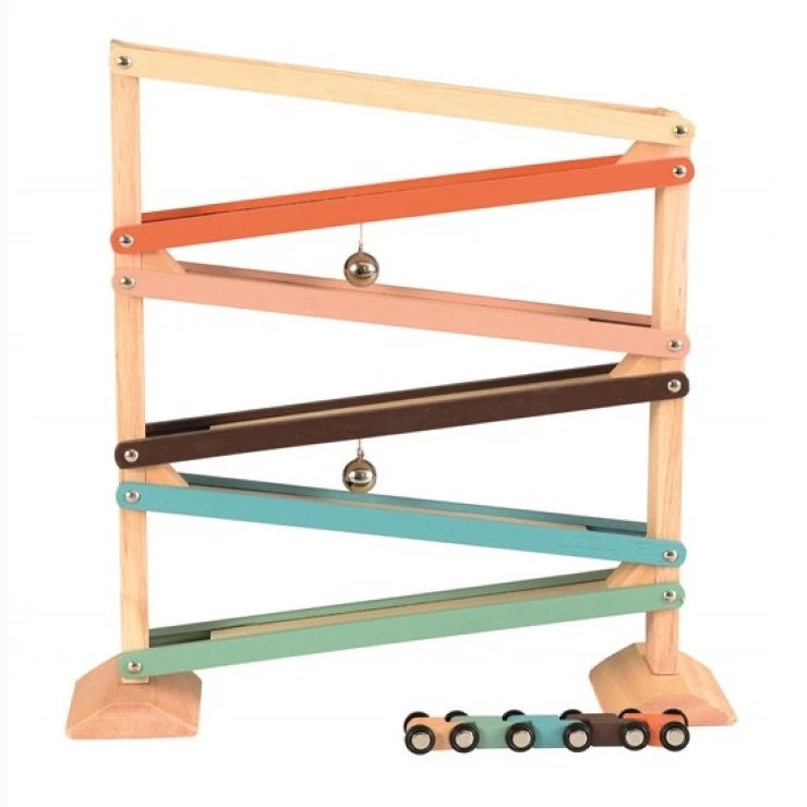 There are hours of fun to be had with this intriguing car ramp, which includes a conjoined set of 4 cars that speed down colourful ramps, chiming the bells along the way. You won’t be able to get enough!