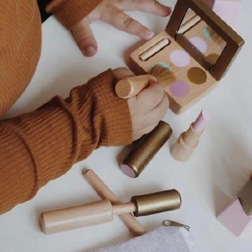 This beautiful wooden makeup set by Astrup includes compacts, nail polishes, eye shadows, perfume bottles, lipsticks, and more, all included in a draw-string bag for storing all 13 pieces.