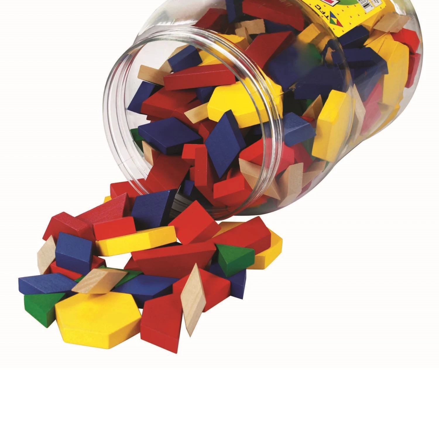 Complete with six shapes in six colours (yellow hexagons, orange squares, green triangles, red trapezoids, blue parallelograms, tan rhombuses).
