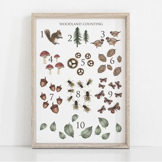 Both educational and beautiful, the detailed woodland numeral print by Floral and Fern will be a stunning addition to your child’s bedroom or playroom. From one squirrel to ten leaves, the exquisite illustrations guide your child from 1-10.